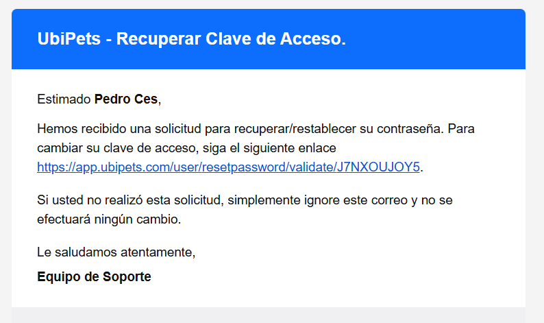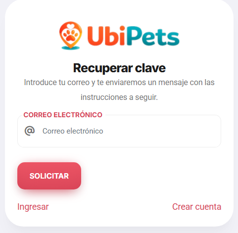 UbiPets te enviara un mensaje a tu correo electronico con un link para recuperar tu clave.