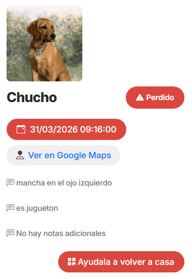 Una vez activada, la mascota quedará visible para otros usuarios, aumentando las posibilidades de que alguien pueda reconocerla y ayudarte. Podras ver la alerta de busqueda en la pantalla inicial.