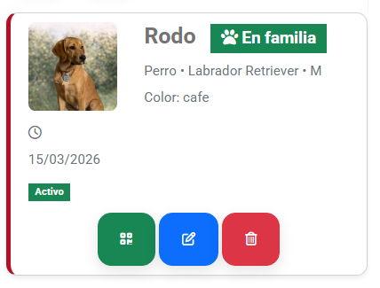 Selecciona el QR perdido y aprieta el botón rojo con el tacho de basura. Este se desvinculara de inmediato.Al confirmar esta acción, el código QR dejará de funcionar, por lo que cualquier persona que intente escanearlo no podrá acceder a la información de la mascota.