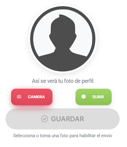 Para cargar una foto de perfil tocando el lápiz, puedes sacarte una con la cámara, tocando el botón rojo que dice camara, o puedes subir una foto del dispositivo, tocando el botón verde que dice subir. Luego de subir la foto aprieta el botón de Guardar.
